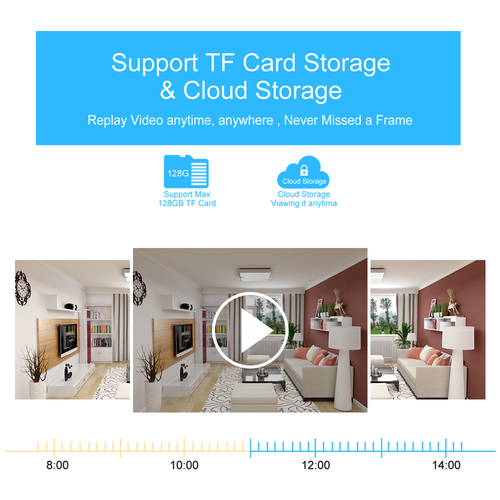 5. Memory: Support local T memory card/cloud storage. After multiple video recording methods are uploaded to the cloud, damage or theft of the camera or memory card will not affect the security of historical video.