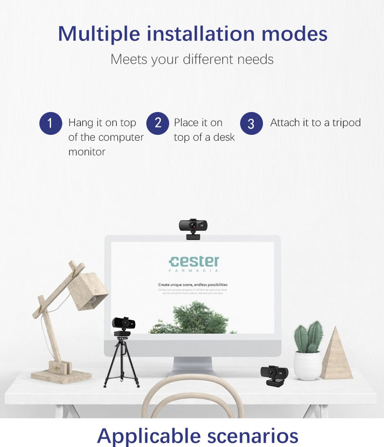 【Multiple mounting options】Integrated clip and tripod thread for easy mounting on LCD monitors, laptops and tabletops.